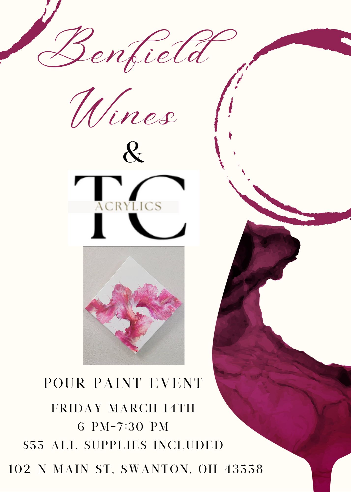 Join Benfield Wine's and TC Acrylics for a night of Pour Painting on March 14th from 6-7:30 PM. Thomas from TC Acrylics guides you through the process of creating a Dutch Pour painting. Come early, or stay late to enjoy their tasting room and wide selection of great food. Located at 102 N Main St, […]